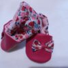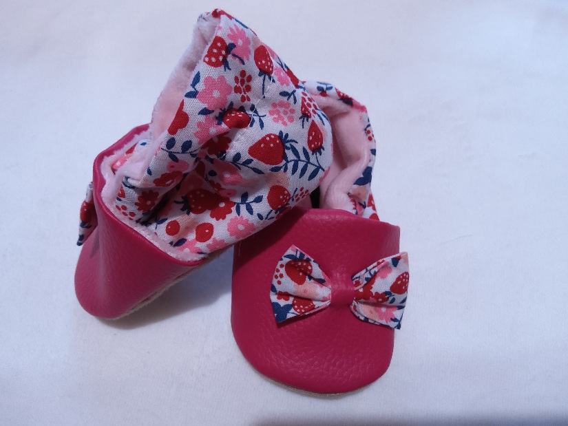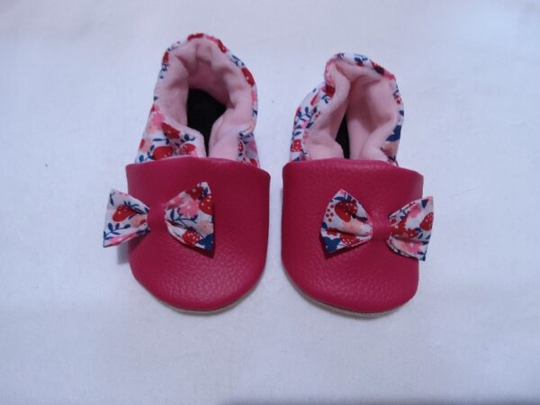 Modèle en simili cuir rose et petit nœud en tissus liberty à fleur et fraise ,l’intérieur est en minky tout doux .