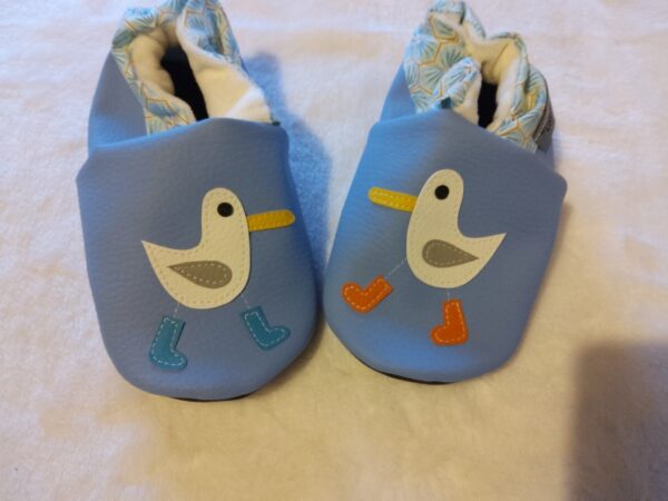 Modèle petites mouettes en bottes de pluie , simili cuir bleu et tissu doublé minky tout doux.