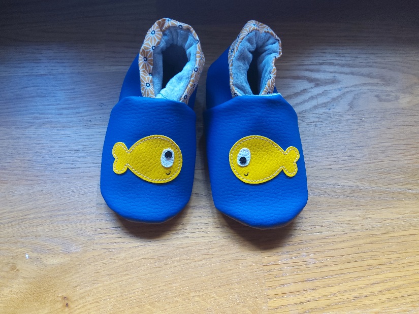 Modèle poissons , simili cuir bleu roi et tissu doublé minky tout doux.