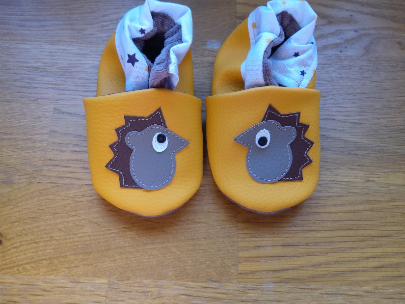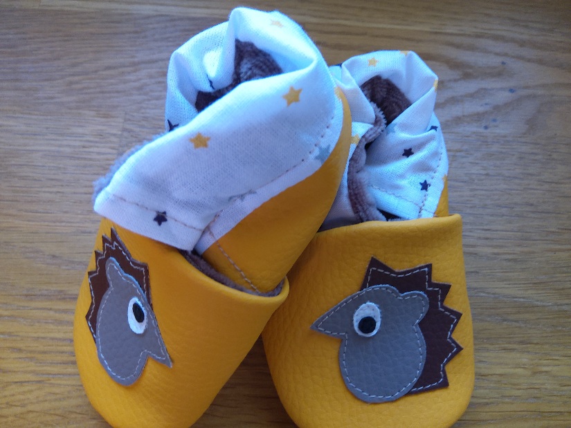 Chaussons souple taille 18 , simili jaune moutarde , tissus graphique, intérieur doublé , semelle doublé.