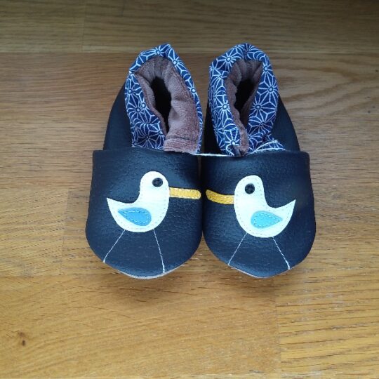 Chaussons souple taille 20 , simili cuir bleu et tissus , intérieur doublé , semelle doublé.
