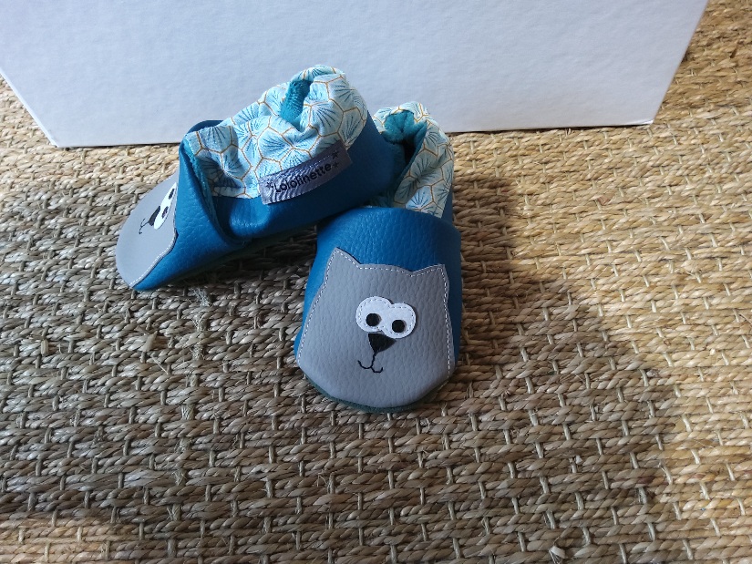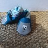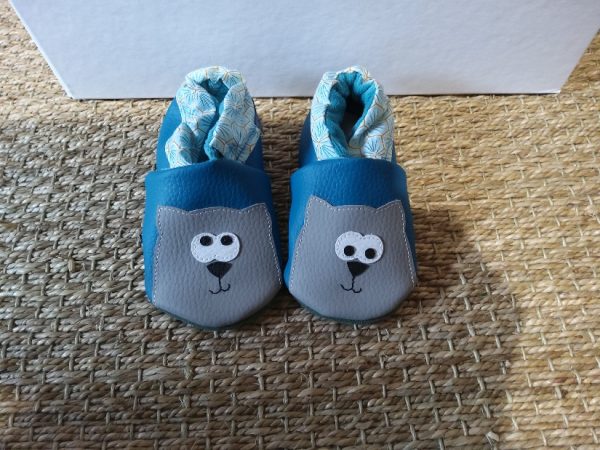 Chaussons souple taille 21 , simili cuir bleu canard et tissus , intérieur doublé , semelle doublé.
